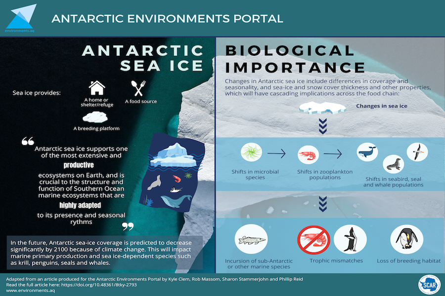 A summary and infographic on the importance of sea ice for Antarctic and Southern Ocean ecosystems.